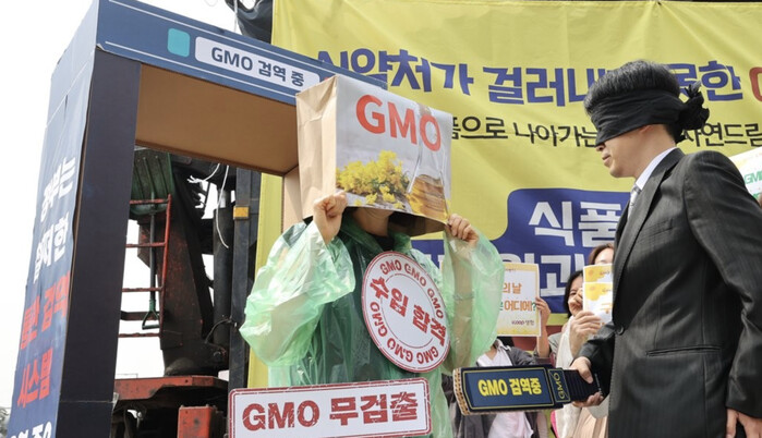 | ▲2023년 시민단체의 GMO 수입통관시스템 강화 퍼포먼스중 한 장면 (사진=연합뉴스) |