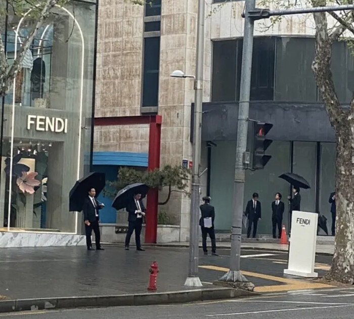 매장 앞 직원이라고 하기에는 우산에 로고가 없고, 해당 지역에서 휴대폰 통신 장애도 일어나고, 복장을 살펴봤을 때 경호원들이 깔린 듯한 모습이기에 그런 추측을 한 것으로 보이지만 실제로 김 여사가 방문했는지 여부는 확인되지 않았다.