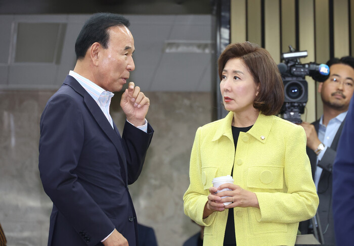 | ▲의총에서 대화중인 박덕흠 나경원 의원 (사진=연합뉴스) |