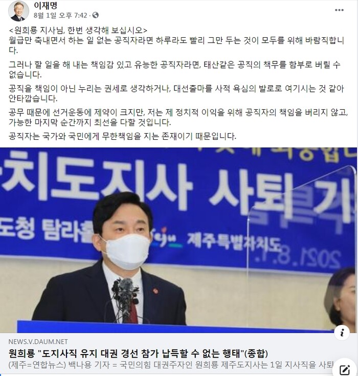 공직을 책임이 아닌 누리는 권세로 생각하거나, 대선출마를 사적 욕심의 발로로 여기시는 것 같아 안타깝습니다.
