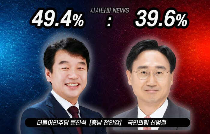 충청신문의 의뢰로 조원씨앤아이가 조사해 28일 발표된 결과는 문 후보가 49.4%, 신 후보가 39.6%를 기록했고 개혁신당 허욱 후보는 3.4%로 나타났다.