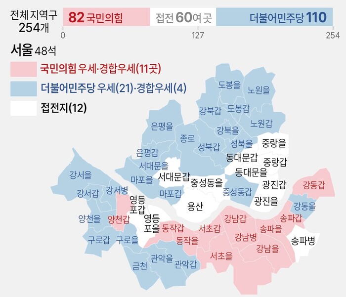 48개 의석이 걸린 서울에서 국민의힘이 판단한 우세 또는 경합우세 지역은 11곳이다.