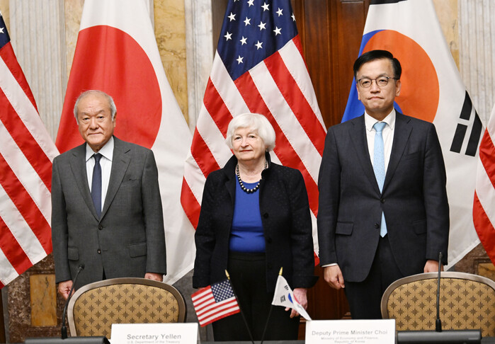 최상목 부총리 겸 기획재정부 장관과 재닛 옐런 미국 재무장관, 스즈키 슌이치 일본 재무상은 이날 미국 워싱턴 D.C. 재무부에서 열린 첫 3개국 재무장관회의에서 이런 내용을 담은 공동선언문을 채택했다.