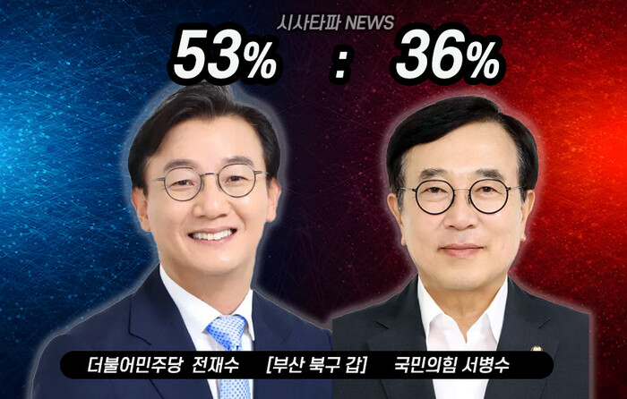 25일 발표된 여론 조사 결과에 의하면 전재수 후보가 53%, 국민의힘 서병수 36%의 지지율을 기록해 전 후보가 17%p 차 오차범위 밖에서 앞섰다.