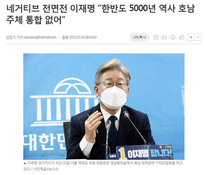 아쉬운 점은 후보님 캠프 관계자들의 극단적 네거티브입니다. 제가 하지도 않은 말을 지어내 '이재명이 인터뷰에서 지역주의 발언을 했다'고 공격하고 있습니다. 지역주의 조장을 하지 말자면서 되려 망국적 지역주의를 조장하고 있습니다. “조용히 하자”고 시끄럽게 고함치는 꼴입니다.