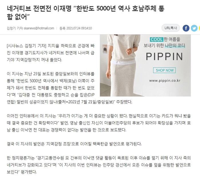 A기자는 지난 24일 중앙일보 기사를 인용하면서, "지지율 하락으로 곤경에 빠진 이 지사가 네거티브 전면에 나서며 급기야 '지역감정'까지 꺼내 들었다" 이 지사가 '백제 발언'으로 지역주의를 조장했다고 하면서, 호남 출신 이낙연 전 대표는 경쟁력이 없다는 발언을 했다고 보도했다. 그런데 이재명지사가 올린 녹음파일에는 그런 말이 없었다.