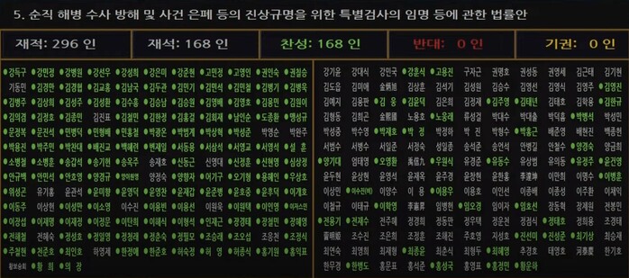 이날 채상병 특검법은 재적 296인 중 재석 168인 찬성 168인으로 본회의를 통과했다.