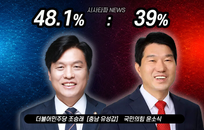 더불어민주당 조승래 후보는 48.1%, 국민의힘 윤소식 후보가 39%로 오차범위 밖의 차이를 드러냈다.
