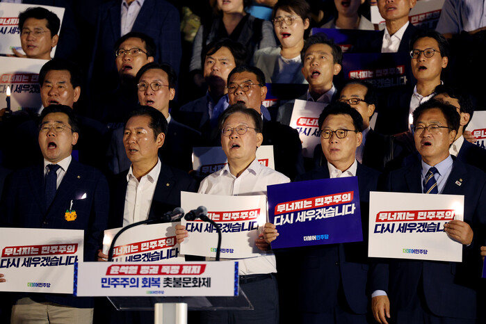2일 민주당은 야권 원로들이 국회 본청 앞 이 대표의 '단식 투쟁 천막'을 찾아 "절벽을 쳐다보고 소리치는 형국으로, 국민께서도 상황이 얼마나 위중한지 공감할 것"이라며 "단식 상황을 지켜보며 국민들이 무엇을 해야 하는지 각성하는 계기가 될 것"이라고 말했다고 전했다.