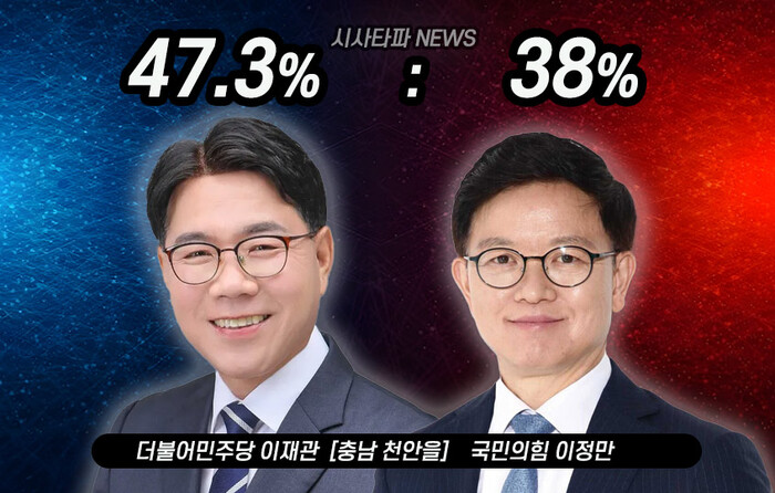 이재관 더불어민주당 후보가 47.3%로 1위, 이정만 국민의힘 후보가 383%, 뒤이어 무소속 전옥균 후보가 3.3%를 차지했다. 지지하는 후보 없다는 4.7%, 잘모름은 6.8%로 조사됐다.