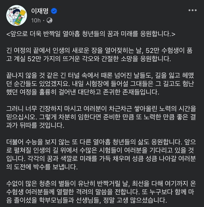 | ▲ 13일, 이재명 더불어민주당 대표의 수능생 응원글 (출처=이재명 페이스북) |
