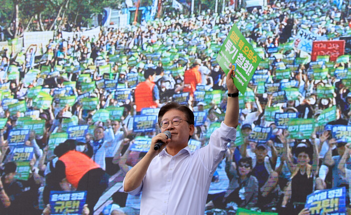 한쪽은 '윤석열 정권 규탄', 다른 쪽은 "일본 핵 오염서 투기 철회"라고 쓰인 양면 손팻말을 들고 무대에 오른 이 대표는 "외국이 대한민국 영토를 침범하고 해양 주권을 침범하면 당당하게 대통령이 나서서 '이건 아니다, 방류를 중단하라'고 말할 수 있는 대통령을 원하지 않았느냐"고 목소리를 높였다.
