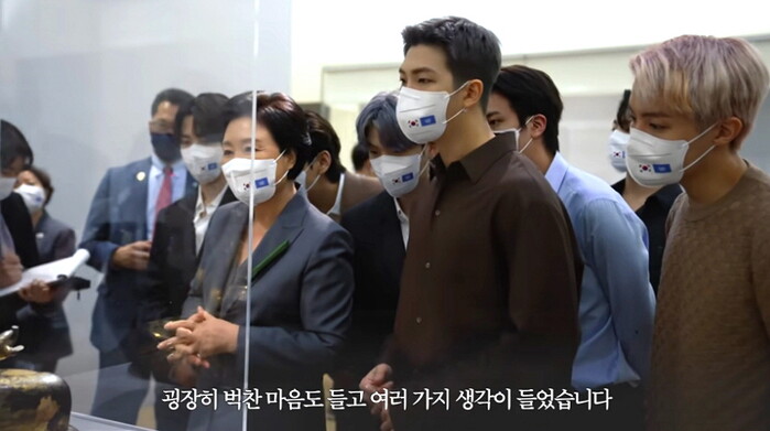 BTS의 리더 RM은 "김정숙 여사님과 한국실을 관람하며 벅찬 마음이 들었다"며 "한국을 대표하는 미래문화특사로서 한국문화의 위대함과 K-컬처의 가능성을 더욱더 확장시키고, 더 넓혀 나갈 수 있도록 사명감을 가지고 열심히 일하겠다"고 밝혔다.