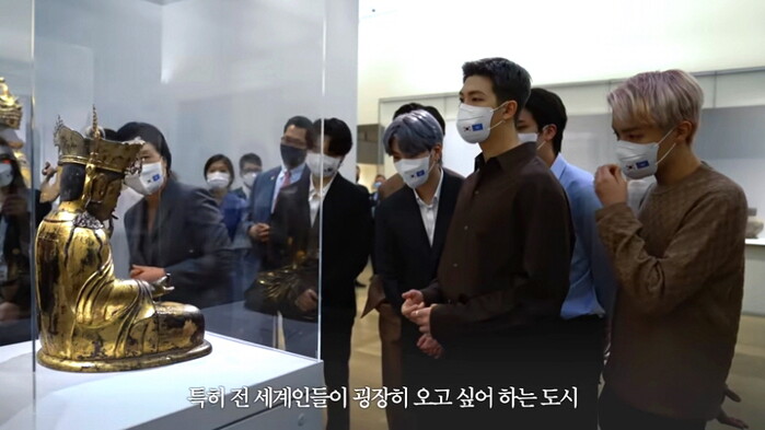 BTS 멤버들은 금동반가사유상을 보며 "좋아하는 작품"이라 밝혔고 RM은 "달항아리의 찌그러진 형태에서 매력을 느낀다"고 감상평을 말했다. 김정숙 여사는 "달항아리는 두 개의 반구를 합쳐 하나가 되는 것"이라 설명하면서 “방탄소년단이 다양한 예술에 조예가 깊다”고 말했다.