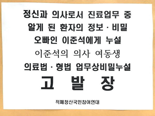 그러면서 "사회 지도층이자 전문직 의사인 피고발인은 양심과 도덕심, 준법정신과 직업윤리를 망각한 채, 정치인인 친오빠 이 대표에게 자신이 진료한 환자의 사생활과 비밀, 의료정보 등을 누설했다"라며 "당시 이 대표가 언론과 방송을 통해 정치적 목적을 갖고 2차 누설·공개한 결과, 고인은 물론 많은 피해가 발생했다"라고 강조했다.