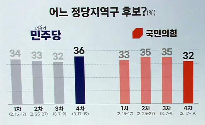 2월 15일 진행된 1차 조사결과에 비해 민주당은 4차가 되면서 상승 국면으로 전환했지만 큰 변동이 없던 국민의힘은 4%p의 격차를 내며 36:32로 약세를 보였다.
