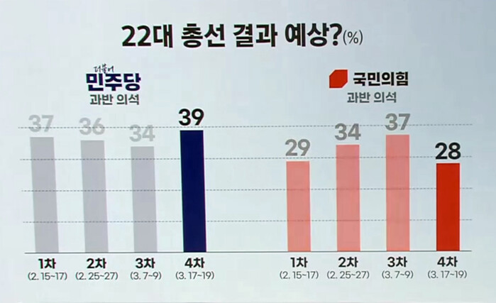 어느 당 후보를 찍을 것인지, 어느 당이 당선될 가능성이 높다고 보는지 지난 2월부터 4차례에 걸쳐 조사한 결과는 민주당이 과반 의석을 차지할 것이라는 예측이 약 11%p정도 격차를 보이며 국민의힘을 압도하고 있다.