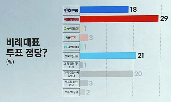 비례대표 정당 지지율의 경우 민주당 측 더불어민주연합이 18%, 국민의힘 측 국민의미래가 29%, 조국혁신당이 21%로 국민의미래가 가장 높았다.