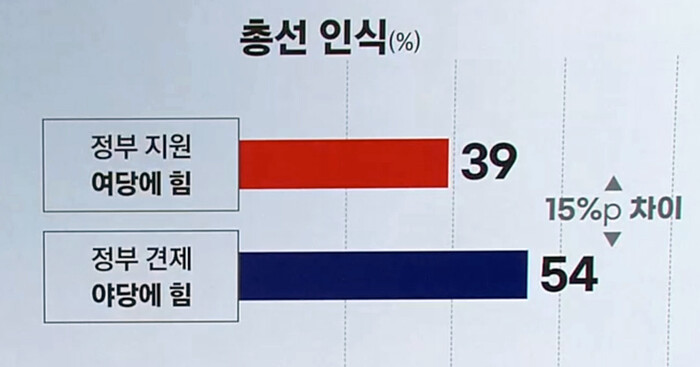 이번 총선의 구도에 대한 질문에는 "정부 견제 야당에 힘"이 54%로 "정부 지원 여당에 힘" 39%에 비해 15%p 차이로 윤석열 정부 심판론에 힘을 실리는 모습이다.
