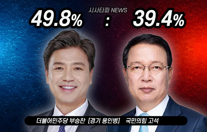 경기 용인병에서 부승찬 더불어민주당 후보가 고석 국민의힘 후보를 오차범위 밖으로 앞선다는 조사결과가 나왔다.
