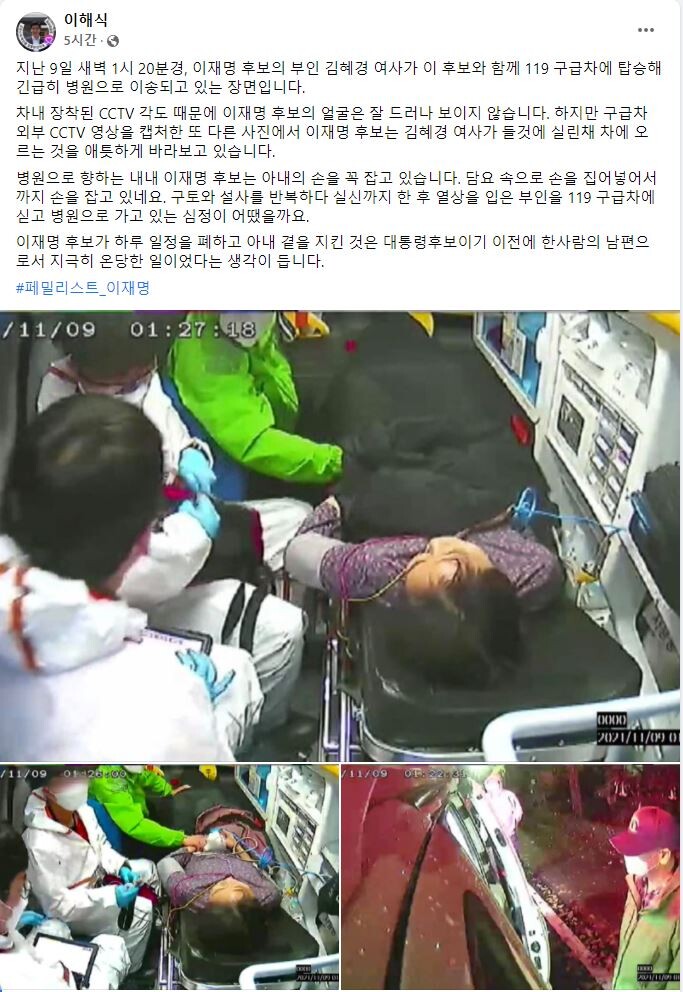 차내 장착된 CCTV 각도 때문에 이재명 후보의 얼굴은 잘 드러나 보이지 않습니다. 하지만 구급차 외부 CCTV 영상을 캡처한 또 다른 사진에서 이재명 후보는 김혜경 여사가 들것에 실린채 차에 오르는 것을 애틋하게 바라보고 있습니다.
