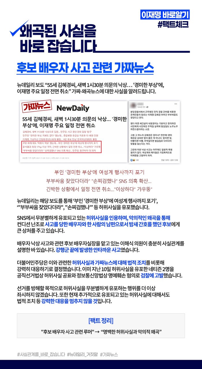 이재명 더불어민주당 대선후보는 "후보 배우자 사고 관련 가짜뉴스" 에 대해서 "선거를 방해할 목적으로 허위사실을 무분별하게 유포" 하는 행위를 더 이상 좌시하지 않겠다고 하였다.