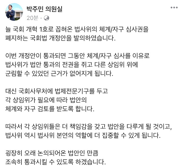 법사위 역시 법사위 본연의 역할에 더 집중할 수 있게 됩니다.
