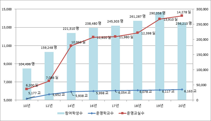 한편 최근 10년간 초등돌봄교실 공급은 2배 이상 늘었다. 교육부는 오후 돌봄교실 외 3~6학년 학생의 돌봄 수요 해소를 위해 2015년부터 방과후학교 연계형 돌봄교실도 운영하고 있다.