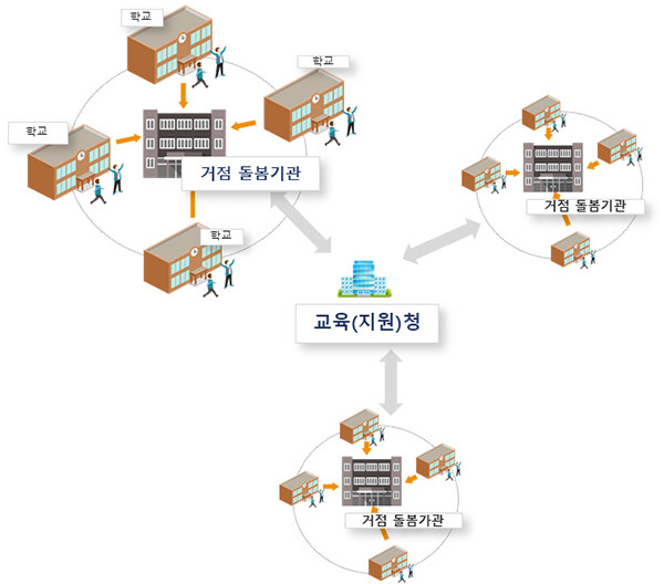 교육(지원)청은 거점형 돌봄교실 운영 전반에 관한 실무를 총괄해 단위 학교의 돌봄 행정업무 경감에 기여하고, 필요시 교육(지원)청 내 별도 조직을 구성해 거점 돌봄기관을 체계적으로 지원한다.