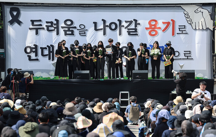 사회자는 "교사의 죽음을 개인의 문제로 축소하는 건 7주 전과 다름이 없다"며 "서이초 사건이 알려진 지 40여 일인데 관리자와 교육부·교육청, 국회는 도대체 어디서 뭐 하고 있느냐"고 비판했다.