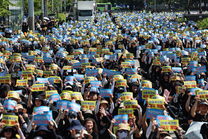 7주째 토요일마다 열린 교사들의 자발적 집회 중 가장 큰 규모로, 국회 정문에서 여의도공원 방향으로 난 8개 차로가 꽉 찼고 공원 주변 도로는 물론 국회에서 1㎞ 떨어진 5호선 지하철역 여의도역까지 교사 행렬이 이어졌다.