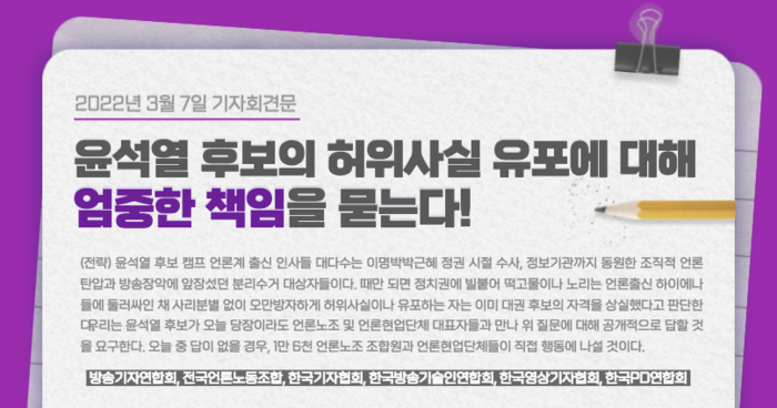 6일(일) 국민의힘 윤석열 대선후보는 의정부 유세에서, 막말을 넘어 허위 사실로 유권자를 기만하고 선동했다. 윤 후보는 민주당이 집권 연장을 위해 국민을 속이고 공작하는 수단으로 "강성노조를 앞세우고, 그 강성노조 전위대를 세워서 갖은 못된 짓을 하는데, 그 첨병 중의 첨병이 바로 언론노조”라 공격했다.