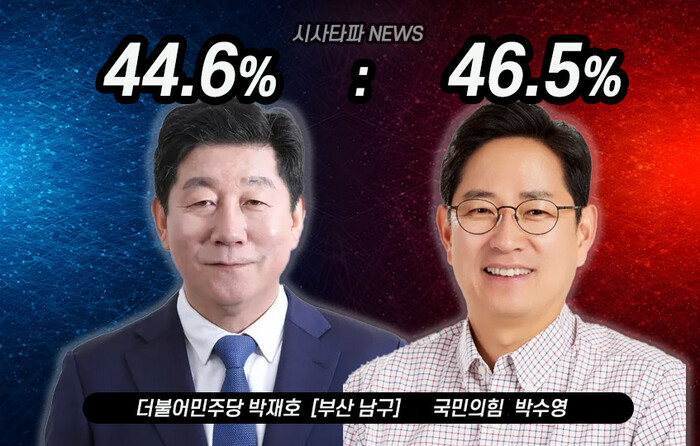 미디어리서치 - 뉴스핌이 조사해서 발표한 29일 결과는 박재호 더불어민주당 후보가 44.6%로 박수영 국민의힘 후보 46.5%에 뒤지는 것으로 드러났다.