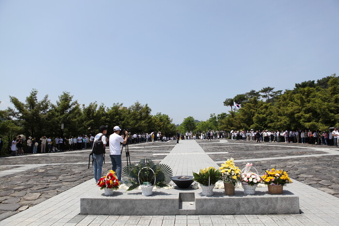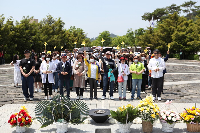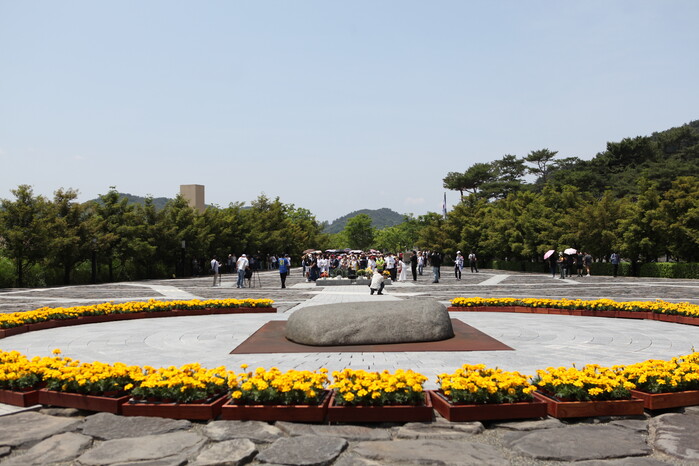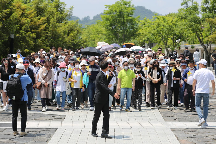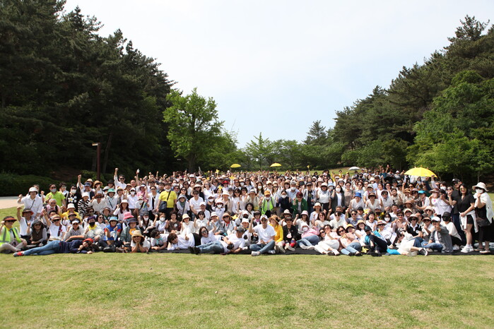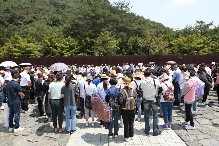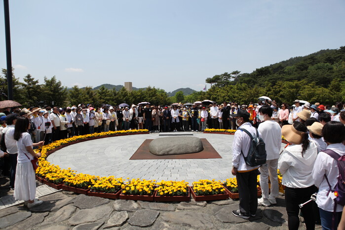 | ▲ 9대의 45인승 버스와 자차 50여대로 참여한 전국의 500여 개국본 회원들이 봉하 마을에 함께 했다 |