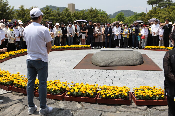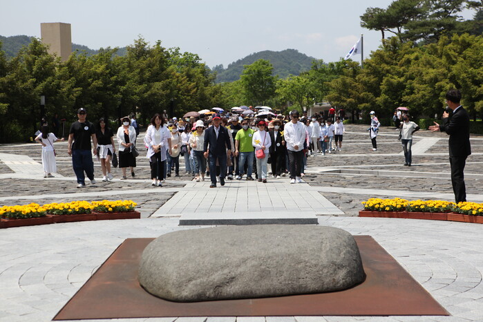 | ▲너럭바위에서 봉하마을에 관한 설명을 듣는 중 |