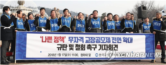 | ▲ 하윤수 한국교원단체총연합회장 및 17개 시·도교원단체총연합회장들이 '무자격 교장공모제 전면 확대 규탄 및 철회 촉구' 기자회견을 열고 있다. 2018.1.17 (사진=연합뉴스) |
