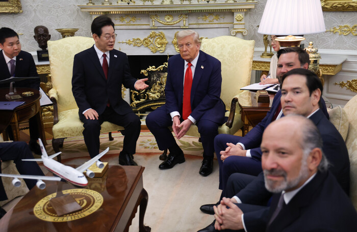 | ▲ 이재명 대통령이 25일(현지시간) 미국 워싱턴 DC 백악관 오벌오피스에서 도널드 트럼프 미국 대통령과 한미 정상회담을 하고 있다. 2025.8.26 (사진=연합뉴스) |