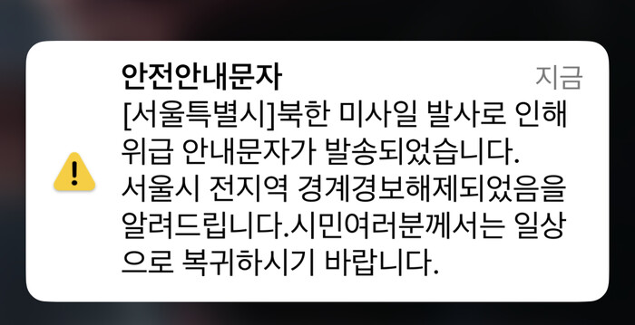 북한 미사일 발사로 위급 안내문자가 발송되었고 시민은 일상으로 복귀하라는 내용이지만 어디에도 오발송 관련 내용이나 시민 혼란에 관한 사과는 없다.