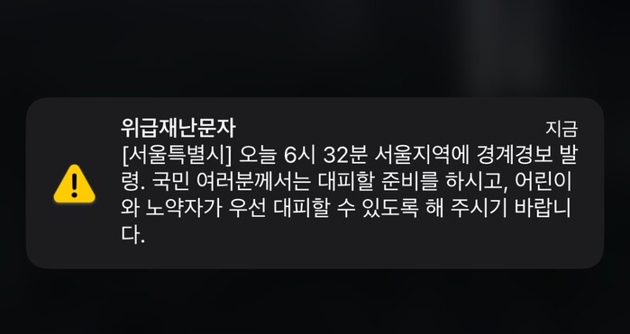 다만 서울시는 경보 지역에 해당하지 않아 서울시가 이날 오전 6시 43분께 보낸 위급재난문자는 잘못 발송된 것이라고 행안부는 밝혔다.