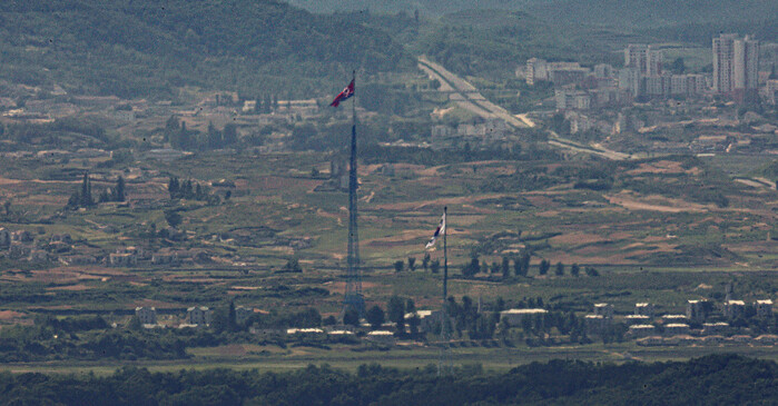 | ▲경기도 파주시 접경지역에서 바라본 DMZ(비무장지대)에서 인공기가 펄럭이고 있다 (사진 출처=연합뉴스) |