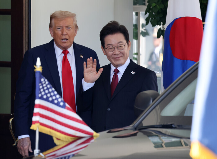 | ▲ 이재명 대통령이 25일(현지시간) 한미 정상회담을 위해 미국 워싱턴 DC 백악관에 도착해 도널드 트럼프 미국 대통령과 취재진을 향해 인사하고 있다. 2025.8.26 (사진=연합뉴스) |