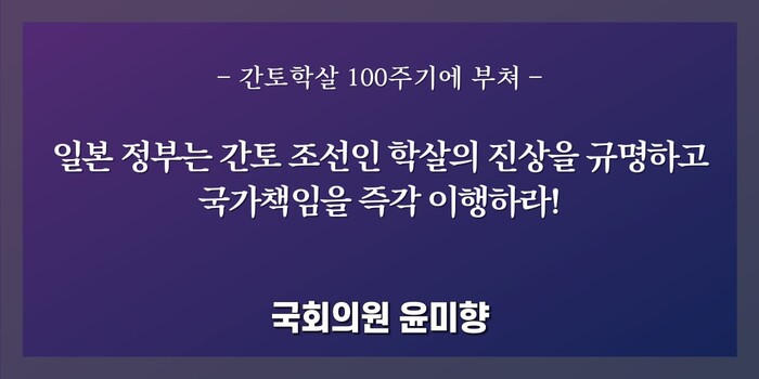 한편, 윤 의원은 "일본 정부는 간토학살의 진상을 명명백백하게 밝히고, 간토학살에 대해 사죄와 배상, 위령, 역사교육 등 국가책임을 져야 한다"면서 "한국 정부는 일본 정부에 간토학살의 진상을 밝히는 조사를 즉각 요구해야 한다"는 페이스북 게시물을 남겼다.