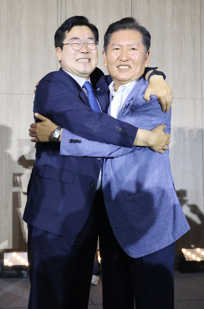 특히 정 의원은 연설 도중 6차례나 박 의원의 이름을 거론하며 "박찬대와 정청래는 안 헤어질 결심을 했다"며 "그 누가 우리를 갈라놓으려 해도 손을 놓지 않고 끝까지 이재명 정부 성공을 위해 함께 가겠다"고 말했다.