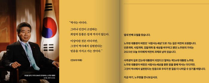 노 전 대통령이 퇴임 후 집필한 ‘진보의 미래’에 적힌 문구다. 재단 측은 역사의 진보를 믿은 노 전 대통령의 생각을 나누겠다는 취지로 주제를 결정했다고 밝혔다.