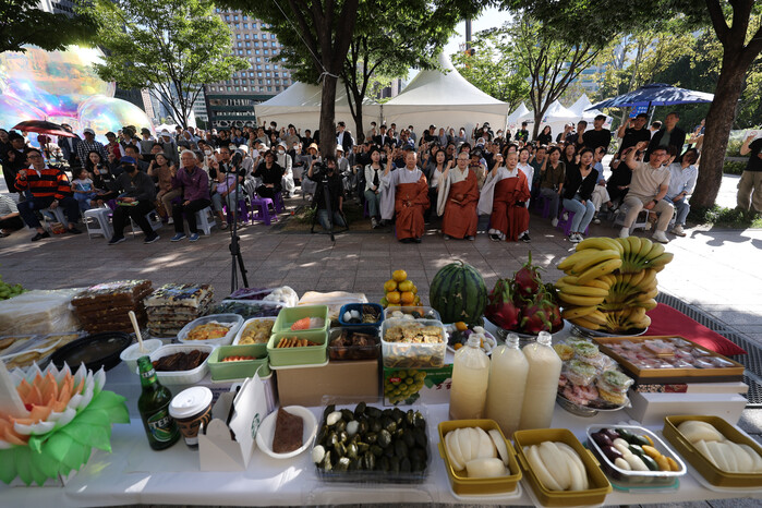 29일 희생자들의 영정사진이 빼곡히 놓인 서울광장 분향소에는 과일과 떡이 차려진 차례상이 놓였고, 유가족, 종교인, 시민 등 100여명이 모였다.