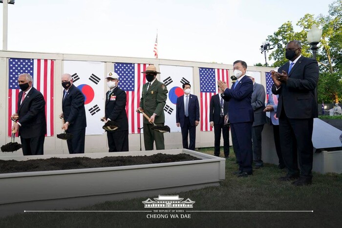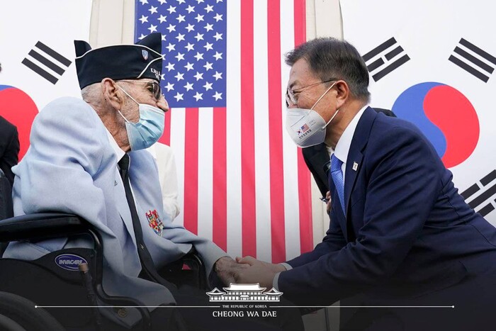 이어서 문 대통령은 "참전 용사의 피와 땀, 우애와 헌신으로 태동한 한미동맹은 사람과 사람, 가치와 가치로 강하게 결속되며 발전해 왔다"며, 미국과 한국은 고통스러운 역사도 영광스러운 순간도 항상 함께해 왔다. “앞으로도 동맹의 힘이 필요한 순간마다 한국은 변함없이 미국과 함께할 것"이라고 다짐했다.