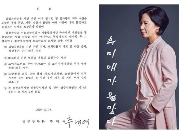 1. 지난 해 10월 19일, 저는 법무부장관으로서 제 2차 수사지휘권을 발동했습니다. 검찰총장 본인, 배우자, 장모 등 측근 비리 사건 은폐 및 수사중단, 불기소 의혹에 대해 총장의 수사관여를 배제하고 수사팀의 독립성을 보장하기 위한 불가피한 조치였습니다. 이에 윤석열 총장은 "중상모략"이라고 하고 ‘가장 점잖은 표현’이라고 공개적으로 반발 했습니다.