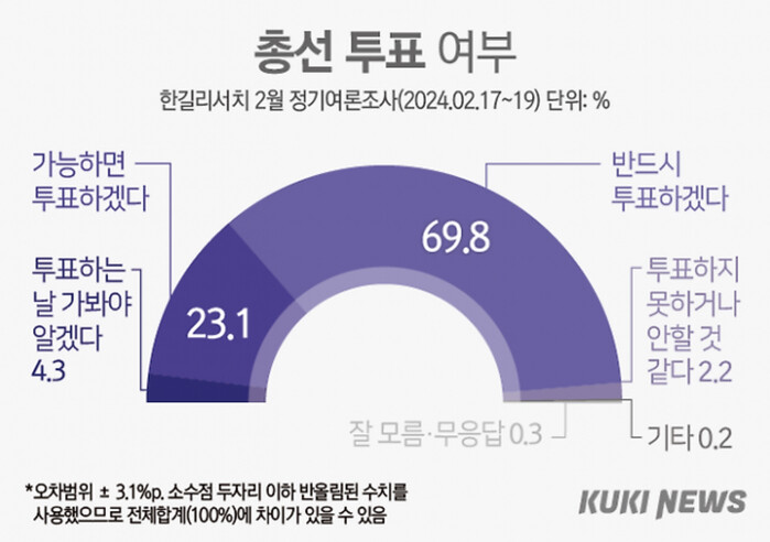 쿠키뉴스의 의뢰로 한길리서치가 지난 17~19일 전국에 거주하는 만 18세 이상 1005명을 대상으로 ‘4·10 총선 투표 의향’을 물은 결과, 전체 응답자 중 69.8%가 ‘반드시 투표하겠다’라고 답했다.