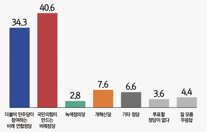 비례정당 선호…국민의미래 40.6%, 民 비례연합정당 34.6%, 개혁신당 7.6%
