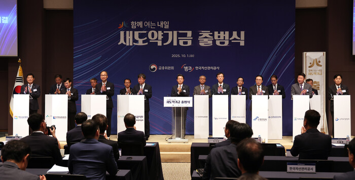 | ▲ 서울 중구 프레스센터에서 열린 새도약기금 출범식에서 이억원 금융위원장을 비롯한 참석자들이 기금 협약서에 서명한 뒤 기념촬영을 하고 있다. 2025.10.1 (사진=연합뉴스) |